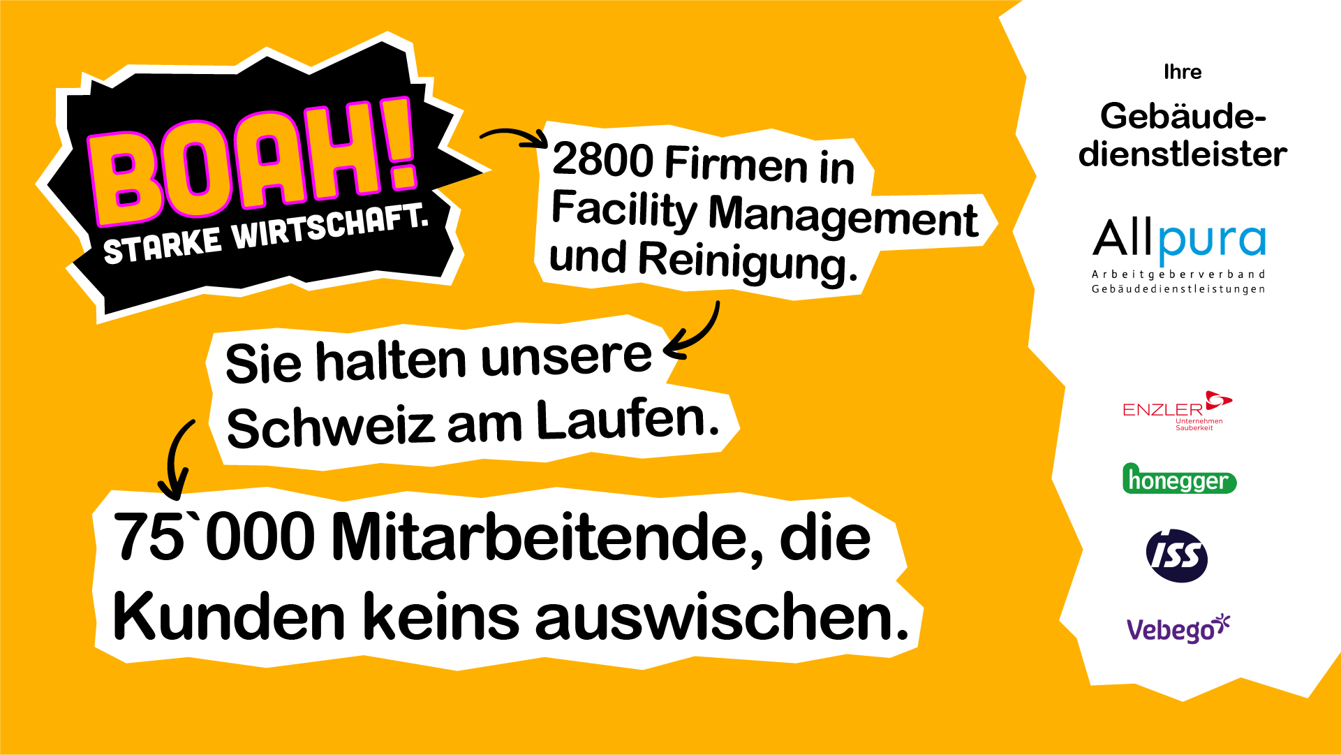 Mit der nationalen Kampagne «WOW, wir die Schweiz! Unser Erfolgsmodell» rückt economiesuisse die Bedeutung einer starken, liberalen Wirtschaft ins öffentliche Bewusstsein. Allpura – gemeinsam mit Vebego Schweiz, ISS Schweiz, Enzler Reinigungen AG und Honegger AG – adaptiert die Initiative für die Gebäudedienstleistungsbranche und zeigt: Facility Services sind systemrelevant, vielfältig und unverzichtbar für die Lebensqualität in der Schweiz.